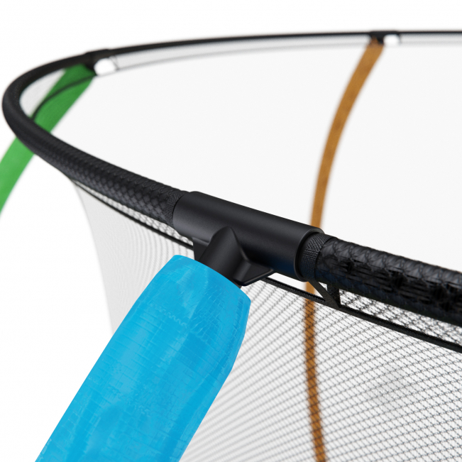 Внутренняя защитная сетка высотой 185 см обеспечивает безопасность пользователей, предотвращая возможные выпады за пределы батута. Она легко открывается и закрывается с помощью специального замка и надежно фиксируется на стойках, выполненных из высокопрочной стали.